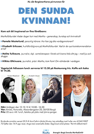 Borgå svenska Marthadistrikt ordnar en må-bra dag med temat Den sunda kvinnan lö 10.10.2015. Under seminariet som hålls i Pomo-huset i Borgå ska jag berätta om Vardagsmotion och vilka positiva effekter du får med att vara igång. Jag kommer att berätta om sittrekommendationer och gamnacke, och mycket mycket mer.